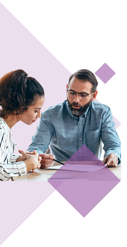 Two people, one holding a tablet and the other with an arm around them, smile at each other. They stand against a geometric blue background.